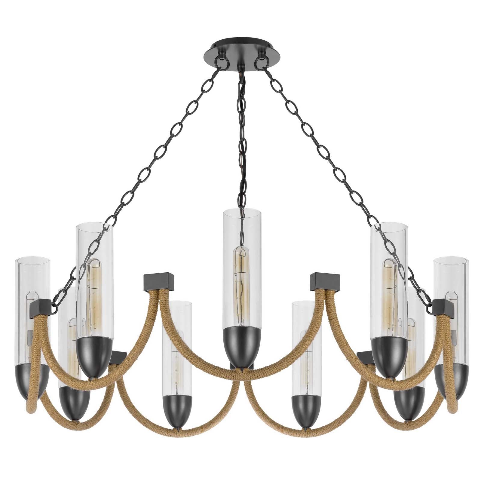 The FX-3815-9 Argyle Metal Chandelier is a stunning addition to any kitchen, living room, or dining room, offering a contemporary candelabra style. With a robust construction of durable metal and a captivating dark bronze finish complemented by brown rope accents, this chandelier features nine cylinder glass shades that require E26 base bulbs, each with a maximum wattage of 60W. Measuring 60W x 9, it includes a matching dark bronze canopy and ships with a 72-inch chain. Assembly is required, and it typically ships within three business days. Enjoy the peace of mind with a one-year warranty against defects in material and workmanship.