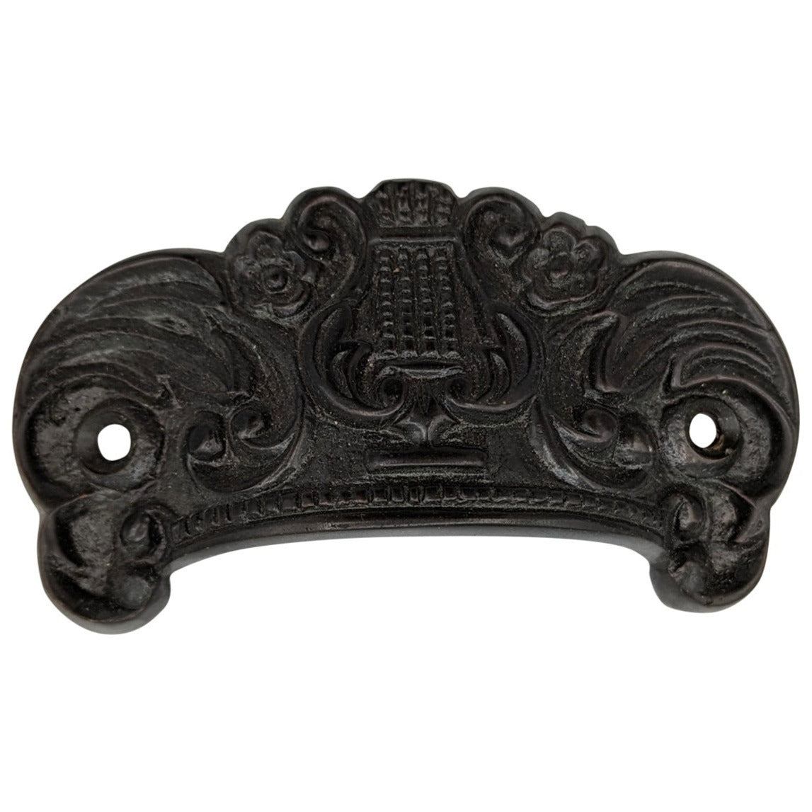 This cup pull measures approximately 3 5/8 inches long by 2 inches tall with a 2 3/4 inch center to center distance. This ornate pull comes with mounting hardware.
