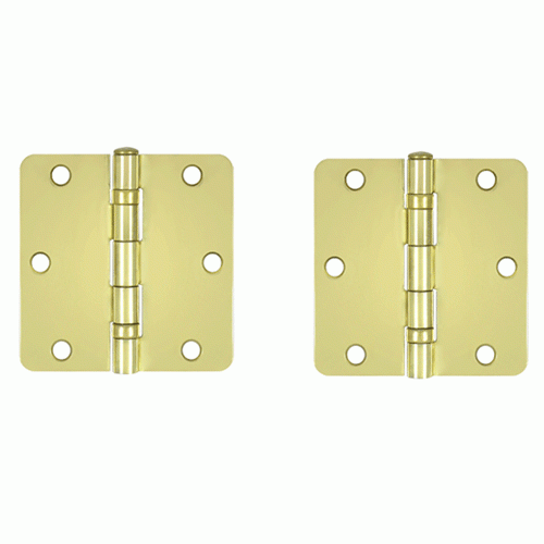 This solid steel hinge from Deltana includes ball bearings and a polished brass finish. This hinge measures 3 1/2 inches tall by 3 1/2 inches wide with 1/4 radius corners. Comes complete with mounting hardware.