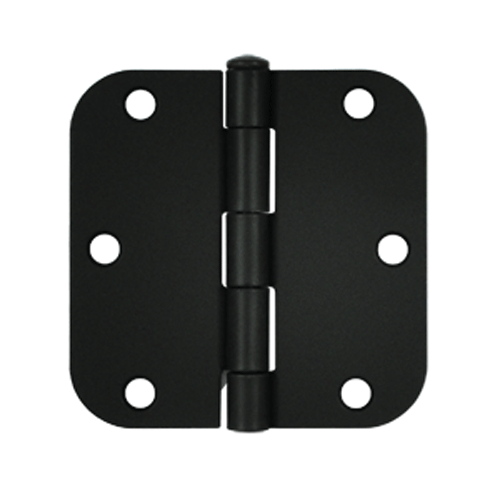 This stylish steel hinge is coating with a paint black finish. Measures 3 1/2 inches tall by 3 1/2 inches wide with 5/8 radius corners. Comes complete with mounting hardware.