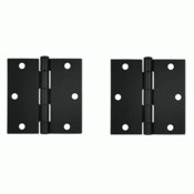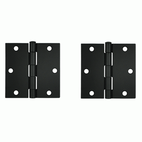 This steel Deltana hinge is finished in paint black. Measures 3 1/2 inches tall by 3 1/2 inches wide and comes complete with mounting hardware.