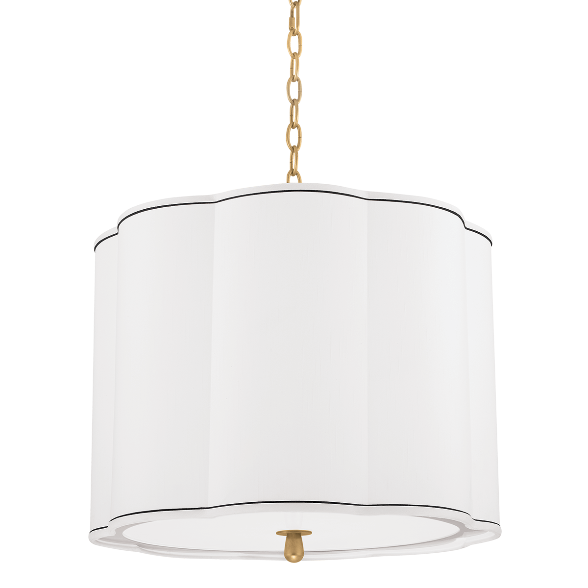 The Sweeny Four-Light Chandelier by Hudson Valley Lighting combines elegance and versatility. With a diameter of 20.00 inches and a height of 18.00 inches, it features a chic faux silk shade in a striking white color accented with navy blue trim. This chandelier utilizes four E12 candelabra base bulbs (not included), supporting a maximum wattage of 60W each. The electrical rating is UL Damp, making it suitable for various interior spaces, and it is available in two beautiful finish options: Aged Brass and Polished Nickel.