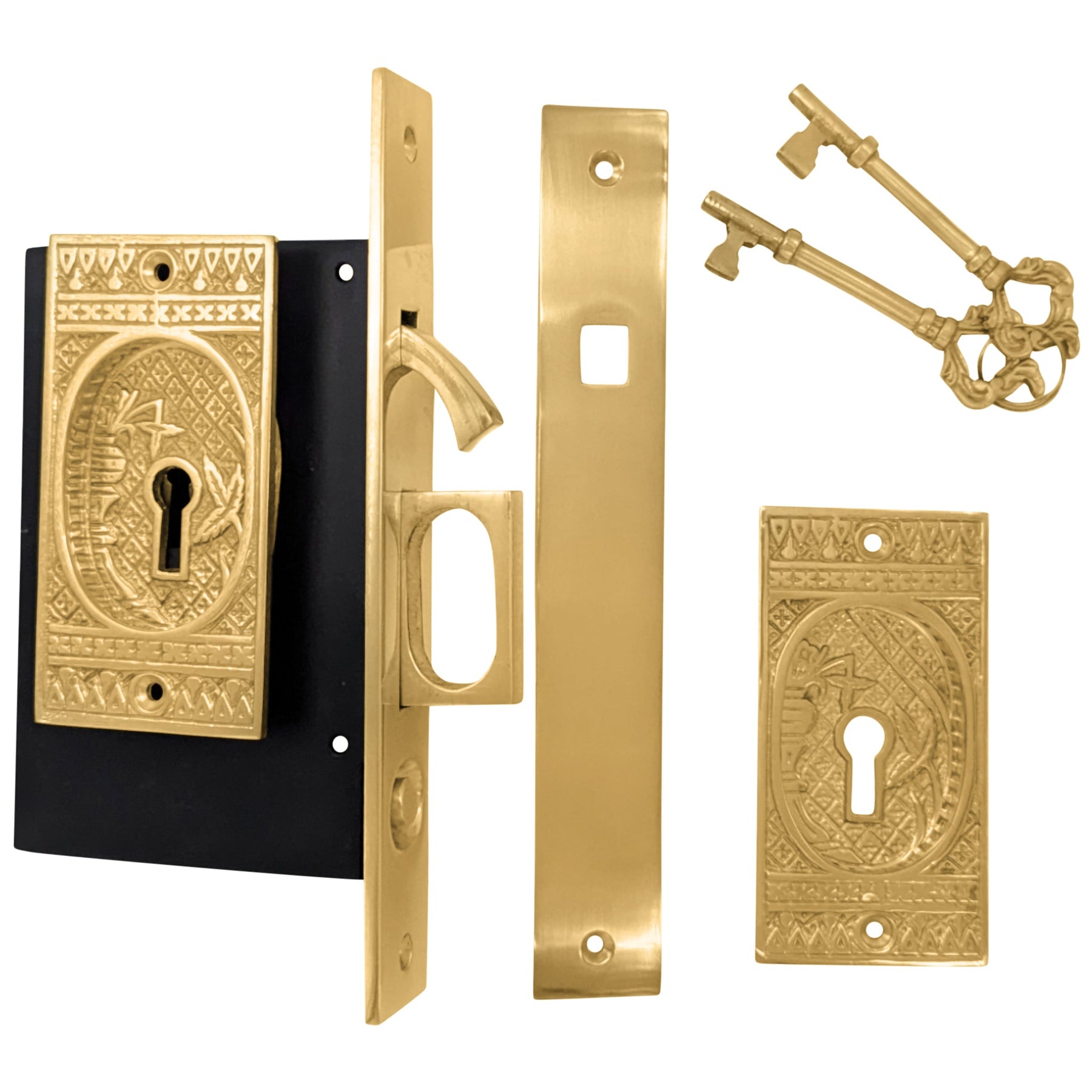 This stylish pocket door set is designed for a locking pocket door. The flush pulls are installed on either side of the door and the mortise latch/edge pull pull is installed into the side of the door to pull the door shut easily and can lock into the door jamb. Locking systems require doors with at least 1 3/4'' thickness. This pattern is called "Broken Leaf" and features a classic earlier twentieth century pattern that emphasized more geometric shapes and a carved design. The lock boxes measure approximately 3 1/4 inches deep (including lip) and 5 1/8 inches high. The lock has a 2 inch backset. Works with a standard skeleton key and comes complete with an ornate set of skeleton keys. The average lead time for this particular product is 20 weeks depending upon the finish chosen.