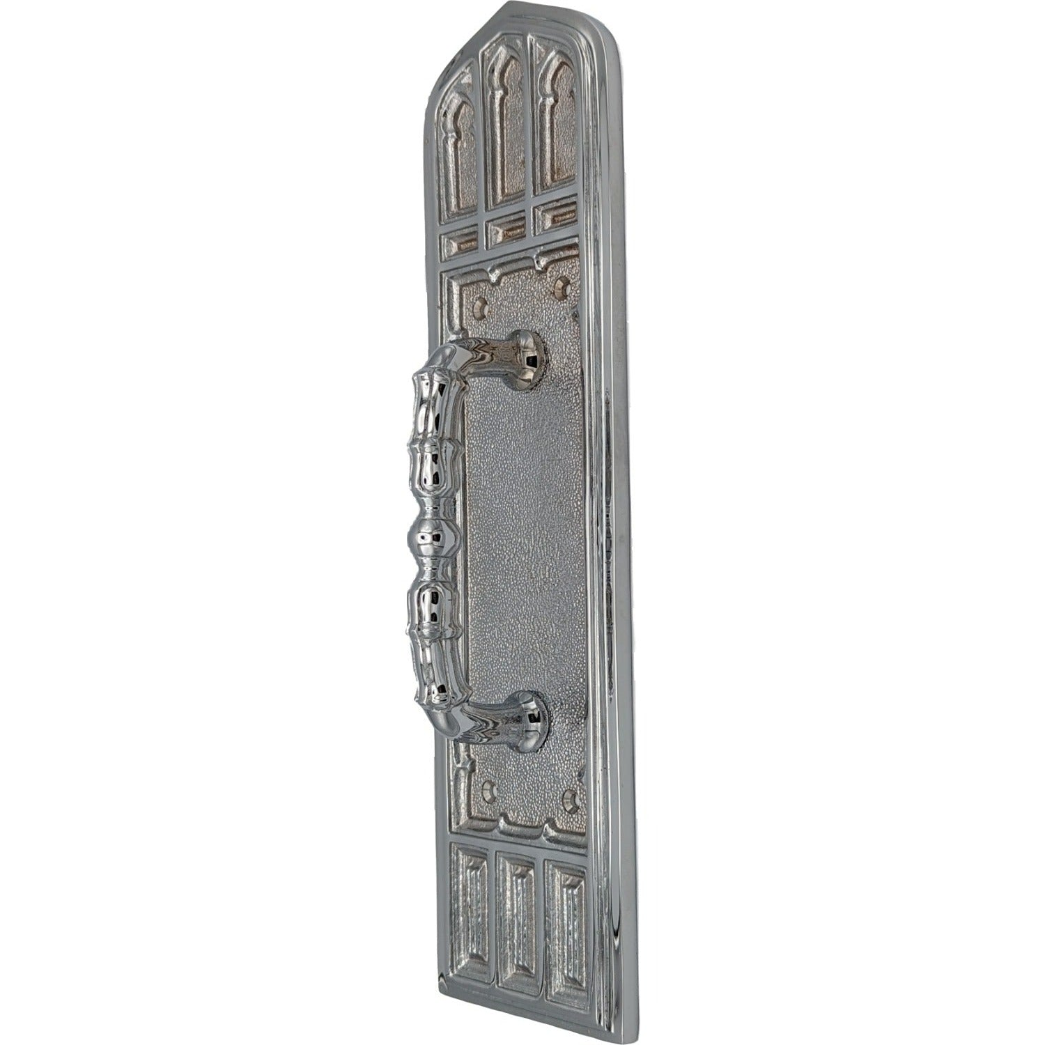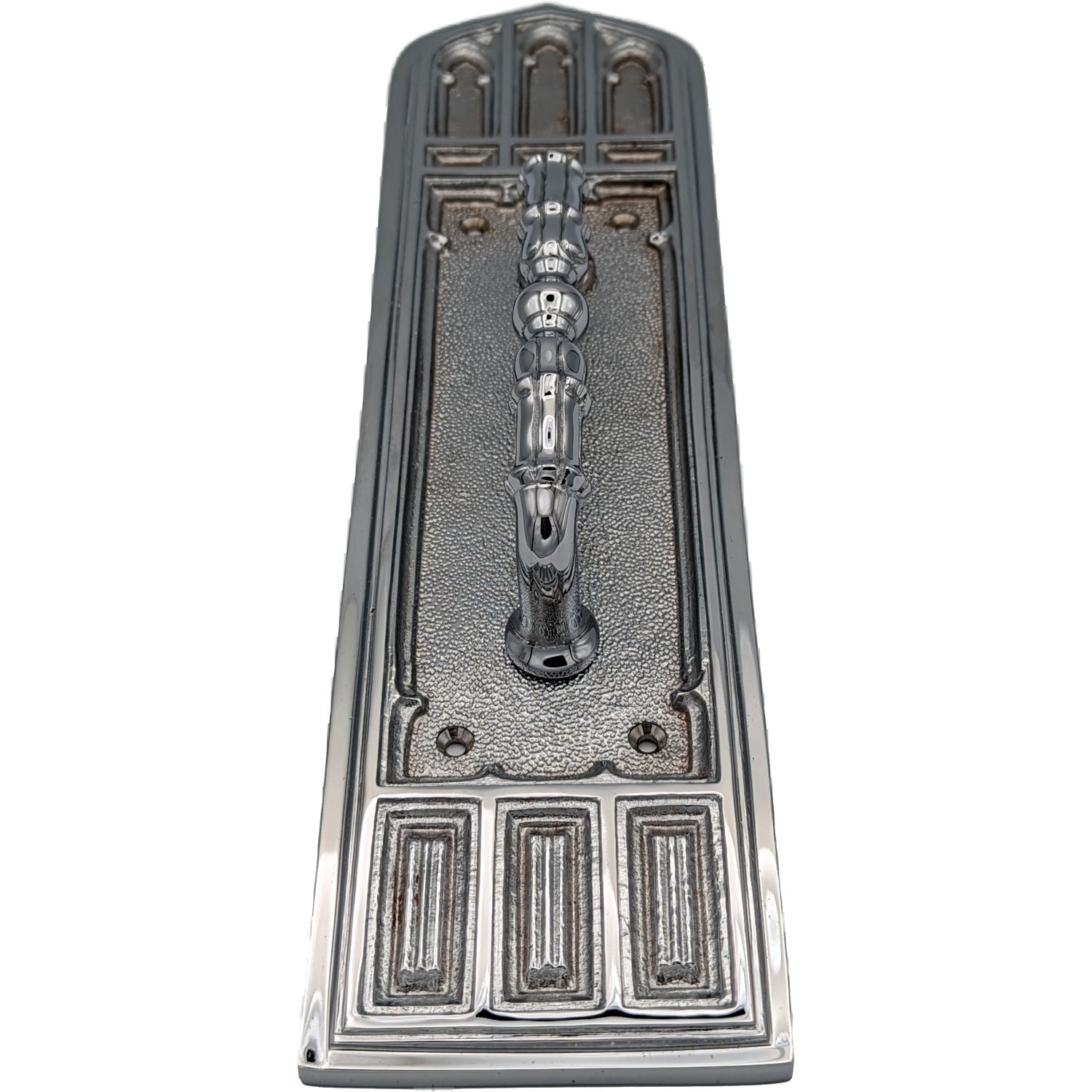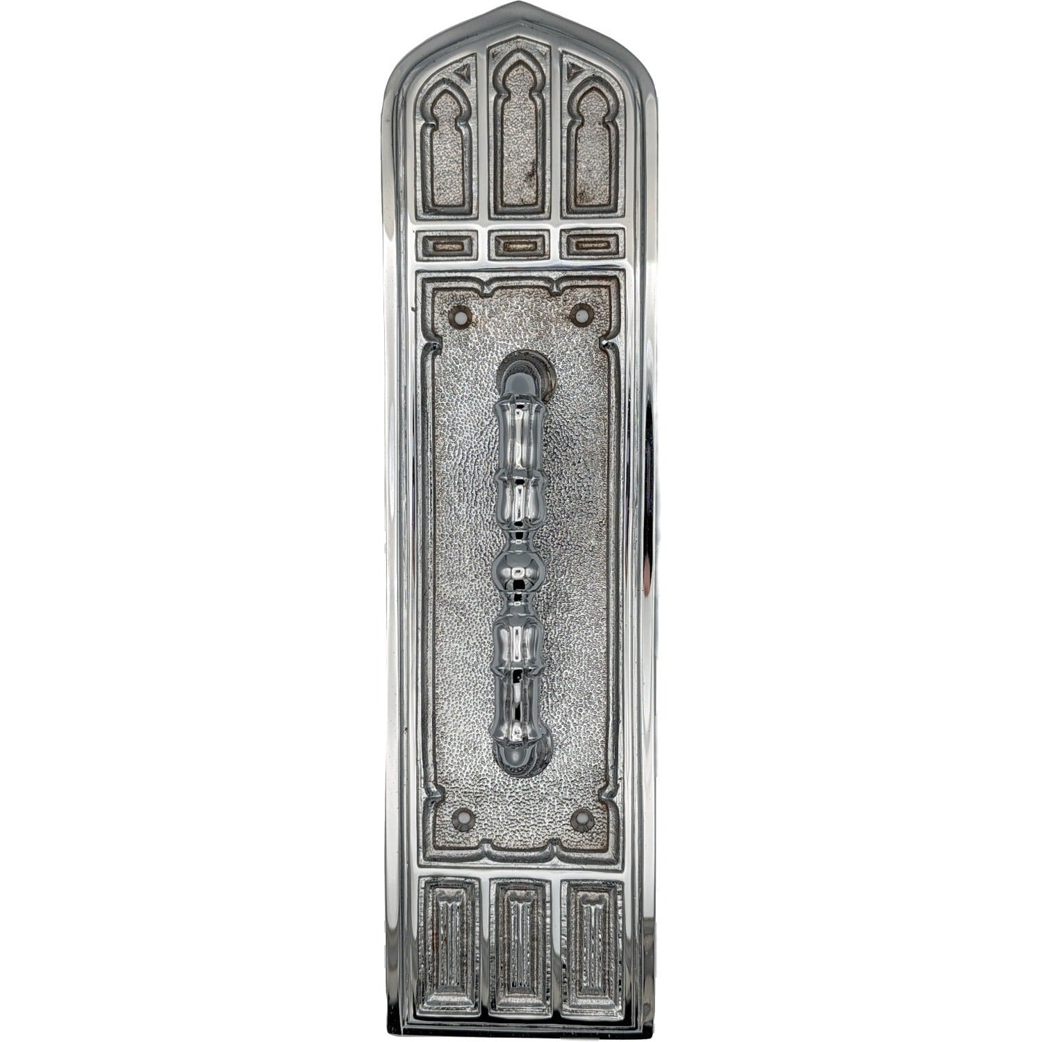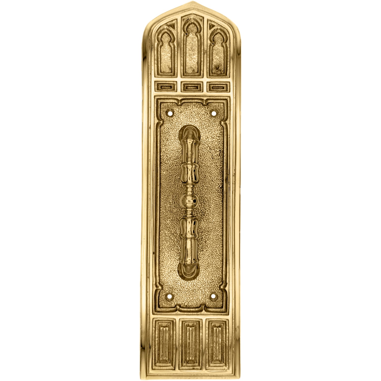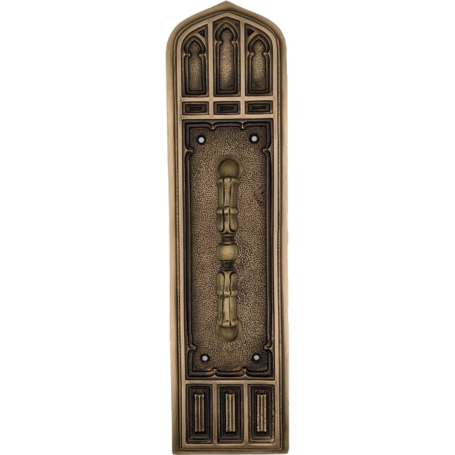 This pull plate is made from solid brass with highly ornate Gothic detailing. It measures approximately 12 1/4 inches tall and 3 1/4 inches wide. Pull measures approximately 5 inches and projects 1 1/2 inches. Available in Antique Brass and Black Bronze finishes. Comes complete with mounting hardware.