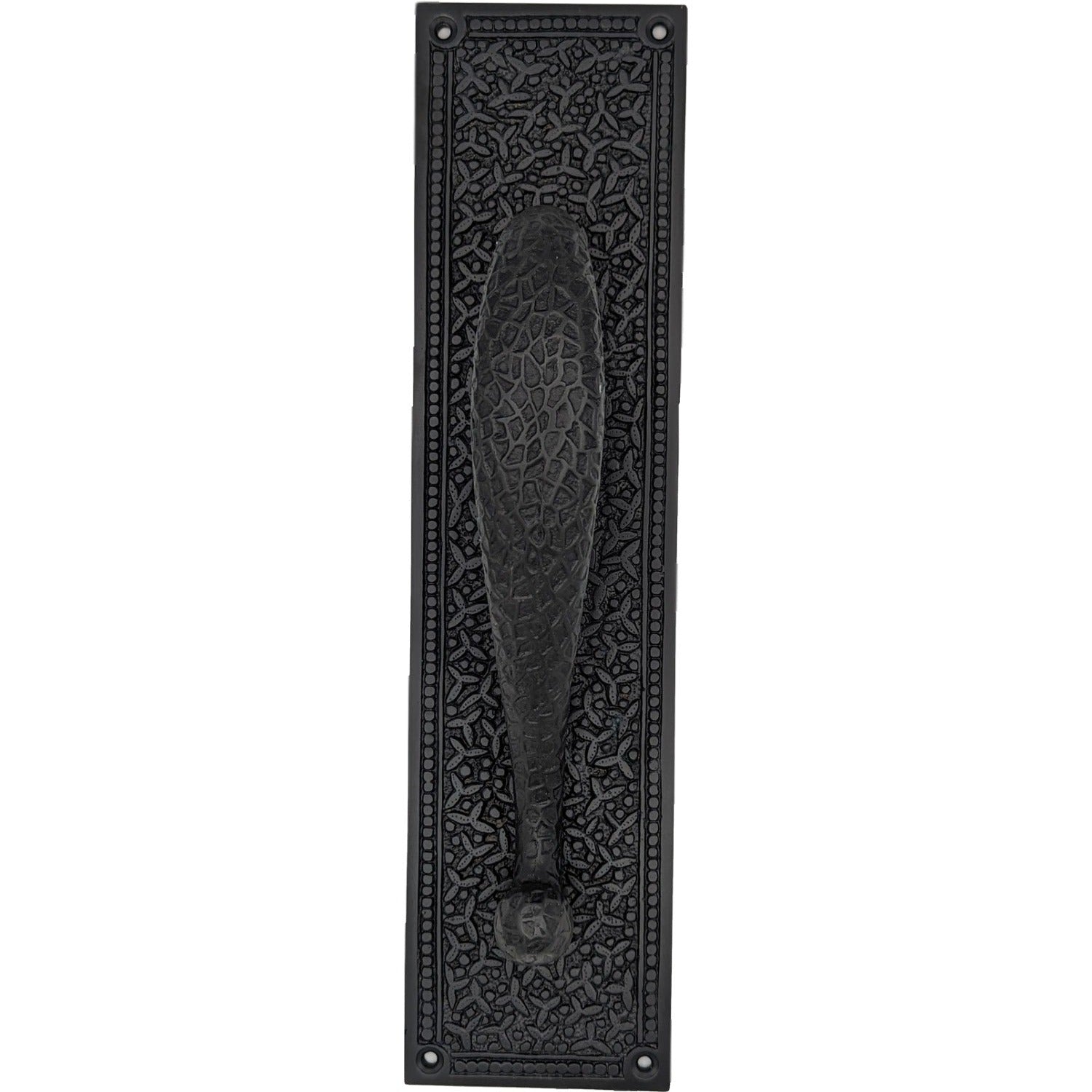 Plate measures 12 inch tall and 3 inch wide. Craftsman Pull is heavy and measures 8 1/4 inch long with a projection of 2 1/8 inch. Center to center mounting distance is approximately 6 1/2 inch (6.50 c-c). This same Craftsman style pull is available in larger 10 1/4 inch and 12 1/4 inch sizes. Solid brass construction allows for decades of service. This product comes as an unlacquered natural brass and it will patina over time. A high strength lacquer coating is available upon request. Comes complete with mounting hardware. Available in a wonderful polished brass finish.
