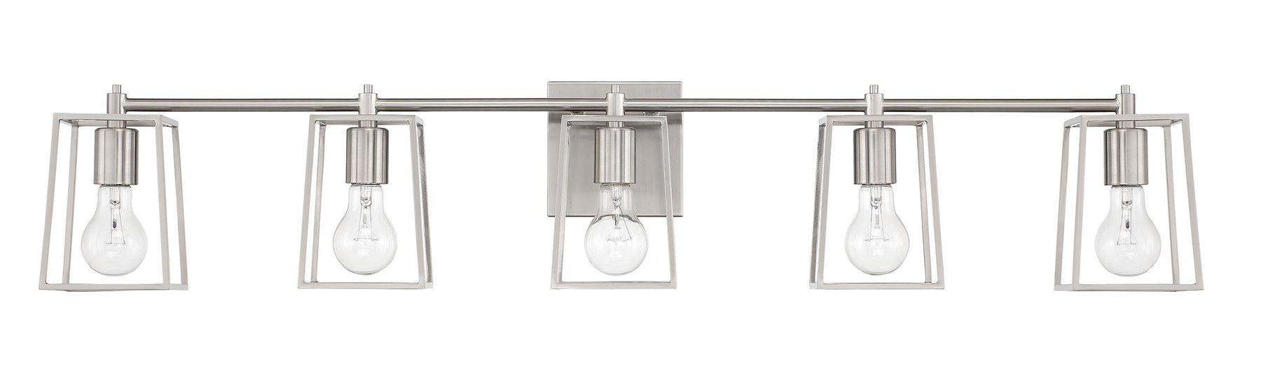 The Dunn 5 Light Vanity in Brushed Polished Nickel is the perfect blend of transitional design and practical functionality. This stylish vanity fixture requires five medium base A19 bulbs with a maximum wattage of 60W (not included) and features a robust damp rating, making it ideal for bathrooms and other humid environments. Measuring 40.88 inches in both width and depth, with a height of 7.88 inches and an extension of 5.87 inches, it provides ample illumination while adding an elegant touch to any decor. The included one-year limited warranty ensures peace of mind, while the cETLus safety rating guarantees reliability.