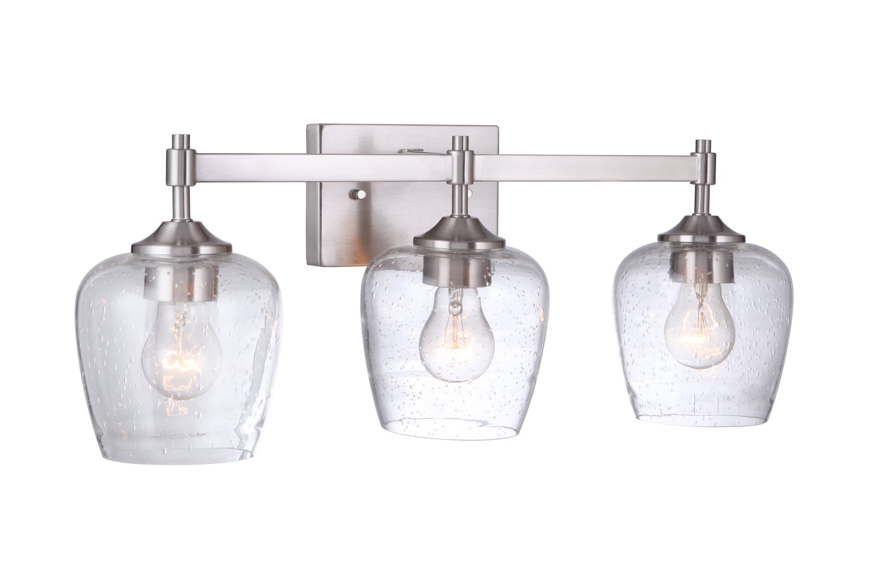 The Stellen 3 Light Vanity in Brushed Polished Nickel is a stylish and functional addition to your bathroom or vanity space. Designed to accommodate three medium base 60 watt bulbs (not included), this fixture features a sleek design with large clear seeded glass curved shades and a minimal back plate. It measures 22 inches in width and depth with a height of 9.25 inches and an extension of 7 inches. The wall-mounted fixture is damp rated, making it suitable for humid environments, and is backed by a 1-year limited warranty.