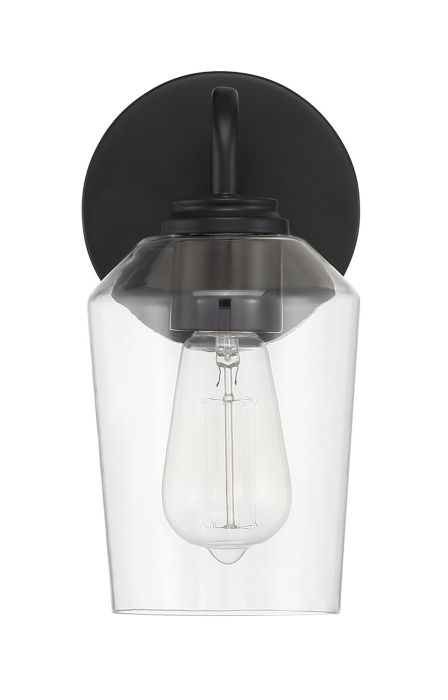 The Shayna 1 Light Wall Sconce in Flat Black is a perfect blend of value and style for your lighting needs. This elegant fixture features a clear glass design and is wall-mounted, specifically rated for damp locations to enhance its versatility. It requires one medium base E26 bulb with a maximum wattage of 60W (not included) and has dimensions of 5 inches in width, 10.75 inches in height, and a 6.50-inch extension. With a safety rating of cULus and backed by a one-year limited warranty, the Shayna wall sconce combines functionality and sophistication in any setting.