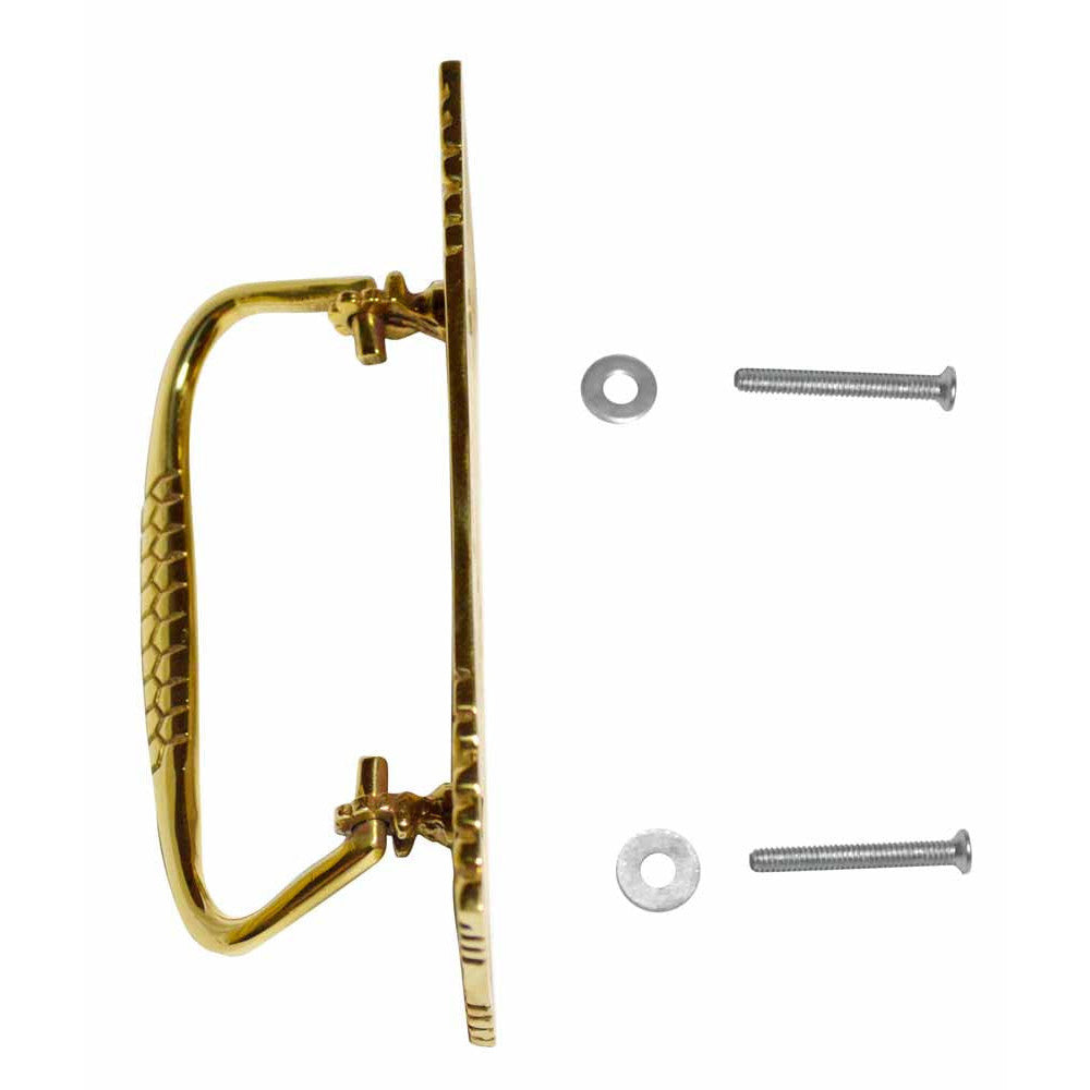 This Pull Plate measures 5 1/8 inches long and 2 1/4 inches tall. Center to center mounting distance is 3 1/8 inches. Highly ornate and hand finished detailing. This bail style pull has a projection of approximately 2 1/8 inches. Comes complete with mounting hardware. This particular product has a lead time of approximately 1 to 3 business days.