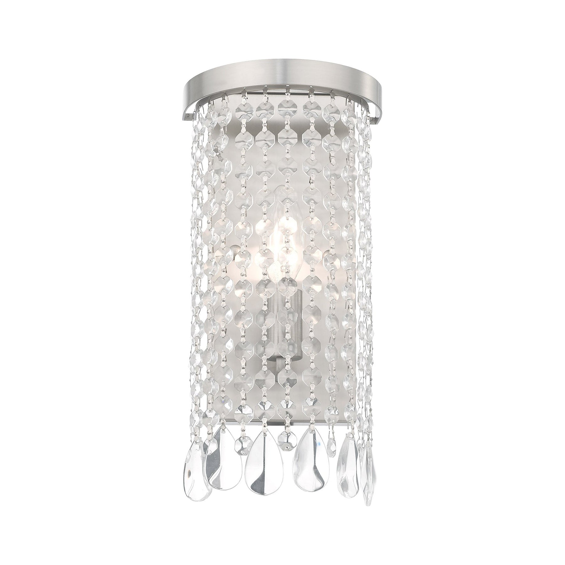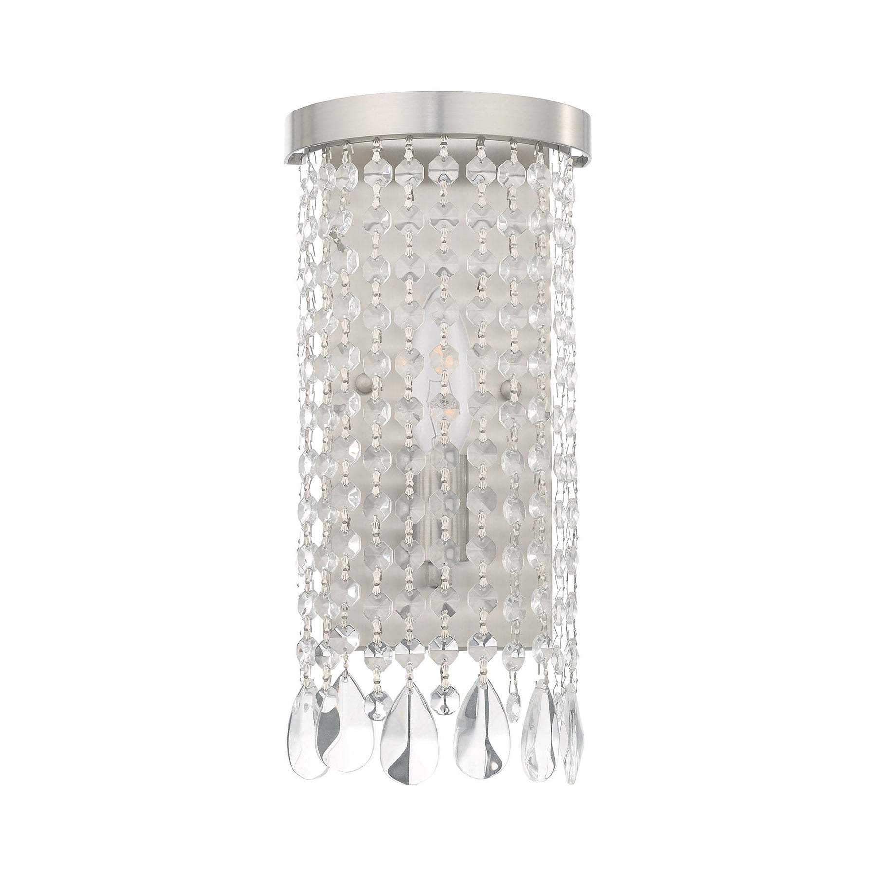 The Elizabeth Wall Sconce, item number 51061-91, features a stunning brushed nickel finish that enhances its elegant design. This transitional fixture, which is perfect for adding a touch of glamour to any space, is equipped with one candelabra base bulb (not included), supporting a maximum wattage of 60W. Measuring 6 inches in width and 12.5 inches in height, with a 3.5-inch extension, this sconce is designed for damp locations, making it an excellent option for bathrooms. The hand-assembled crystal shade adds a dazzling detail, allowing the sconce to serve as both a functional light source and a stylish accent piece.