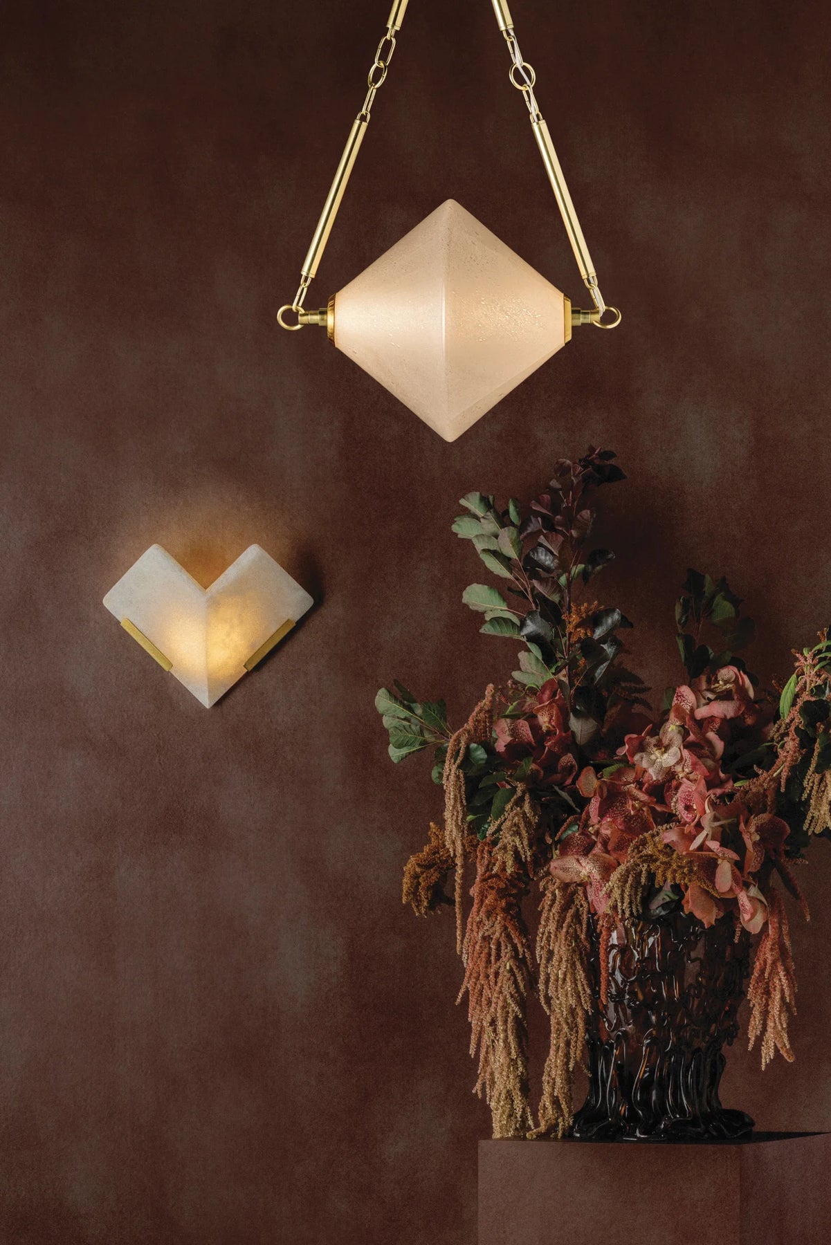 Geo is defined by its quiet strength and sculptural clarity. Glowing panels of honey onyx are book matched to reveal mirrored veining—an artisanal detail more often seen in luxury surfaces than lighting. The symmetry of the stone takes center stage, framed by clean, minimal metalwork in Vintage Brass that amplifies its natural elegance. Available as a 1-light wall sconce in two shapes and sizes, as well as a 1-light flush mount, Geo offers a soft, grounded glow that feels both bold and restrained. Its graphic silhouette and elemental beauty lend structure and visual rhythm to interiors.