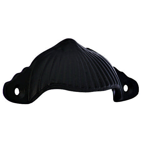 4 1/8 Inch Solid Iron Art Deco Fan Cup Pull (Matte Black Finish). Measures 4 1/8 inch wide and 1 1/2 inch tall with a projection of 3/4 inch. Comes complete with mounting hardware.