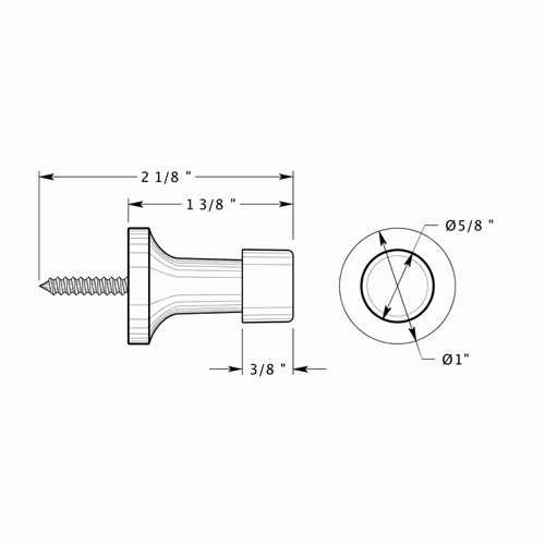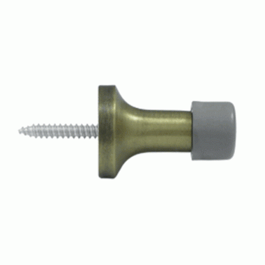 1 1/2 Inch Solid Brass Baseboard Door Bumper (Antique Brass Finish) - measures 1 1/2 inches long. This style of door stop provides protection for the door by preventing it from banging against a wall causing damage to drywall or plaster and paint. This door stop is available in many designer finishes and comes complete with the mounting hardware.