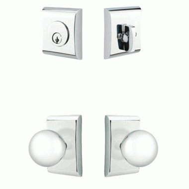 Emtek Single Door Entryway Orb Knob With Neos Rosette (Polished Chrome Finish) - this entryway set measures 2 1/2 inches wide. The deadbolt plate measures 2 3/4 inches tall, and the door plate measures 4 5/8 inches tall. Various styles of knobs available at no additional charge. Entryway backset comes as 2 3/8 inch standard and a 2 3/4 inch backset is available if required. The overall grip thickness is 1 1/16 inch. The clearance between the door and grip is 1- 1 3/8 inches. The plates have a thickness of 7/16 inch. This is a complete set and it comes with tubular latch mechanisms, strike plates, complete knob sets, internal mechanisms, deadbolts and all mounting hardware.