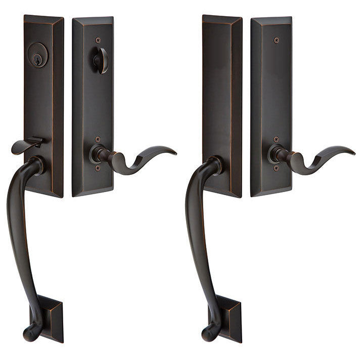 Solid Brass Adams Style Entryway Set (Oil Rubbed Bronze Finish) - this entryway set measures 2 3/4 inch wide by 18 1/8 inch tall. Various styles of knobs available at no additional charge. Entryway set deadbolt to knob center-to-center distance is 5 1/2 inches. Entryway backset comes as 2 3/8 inch standard and a 2 3/4 inch backset is available if required.