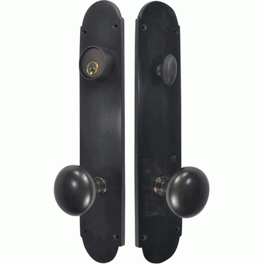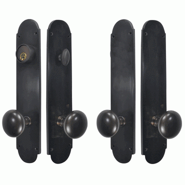 This entryway set is made from solid brass and measures 2 1/2 inch wide by 12 inch tall. Shown with the glass Vassar round knob. Other styles of knobs available at no additional charge. Entryway set deadbolt to knob center-to-center distance is 5 1/2 inches - other center-to-center distances are available upon request. Entryway backset comes as 2 3/8 inch standard and a 2 3/4 inch backset is available at no additional charge. This is a complete set and it comes with tubular latch mechanisms, strike plates, complete knob sets, internal mechanisms, deadbolts and all mounting hardware.