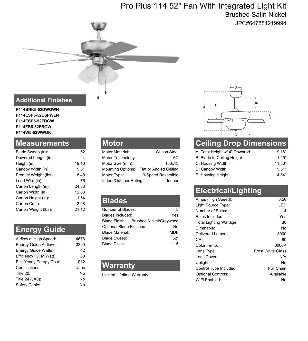 52" Pro Plus 114 in Brushed Nickel w/ Brushed Nickel/Greywood Blades