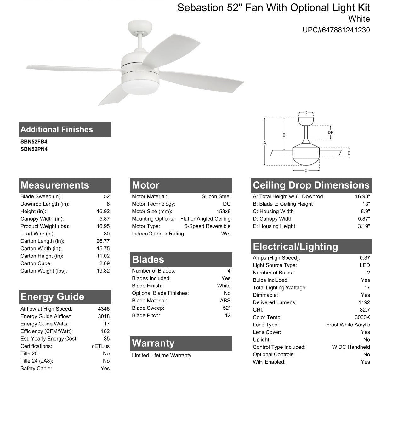 Excellent performance and timeless style combine in the 52" Sebastion smart ceiling fan from Craftmade. Wet rated for indoor or outdoor use, the 52" Sebastion features a quiet energy saving 6-speed, reversible DC motor, custom blades, integrated dimmable LED light with optional lens cover included and is easily controlled with either the included remote controls or the integrated Wi-Fi featuring breeze and timer functions compatible for use with most smart home devices, smart phones and systems with no additional hub needed.