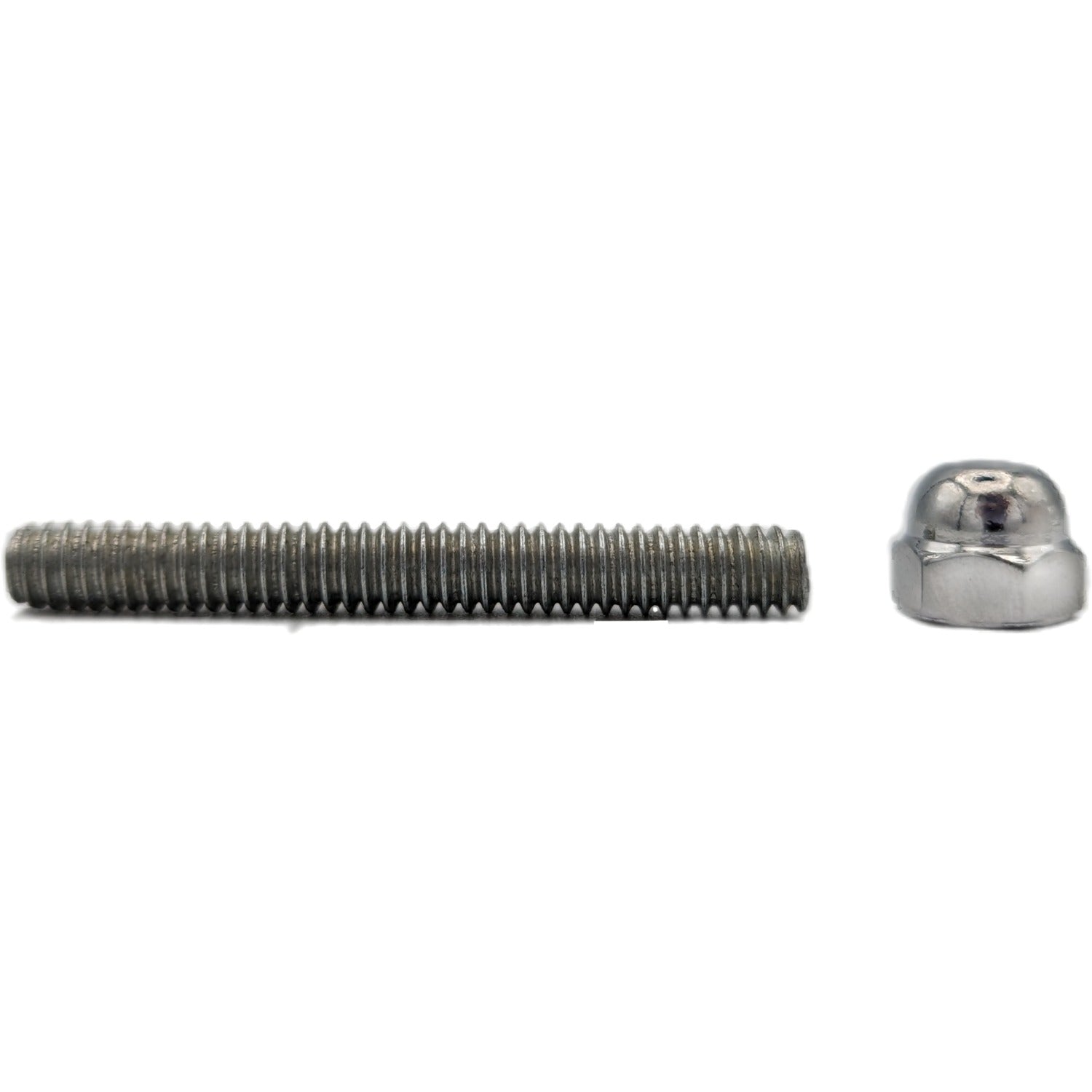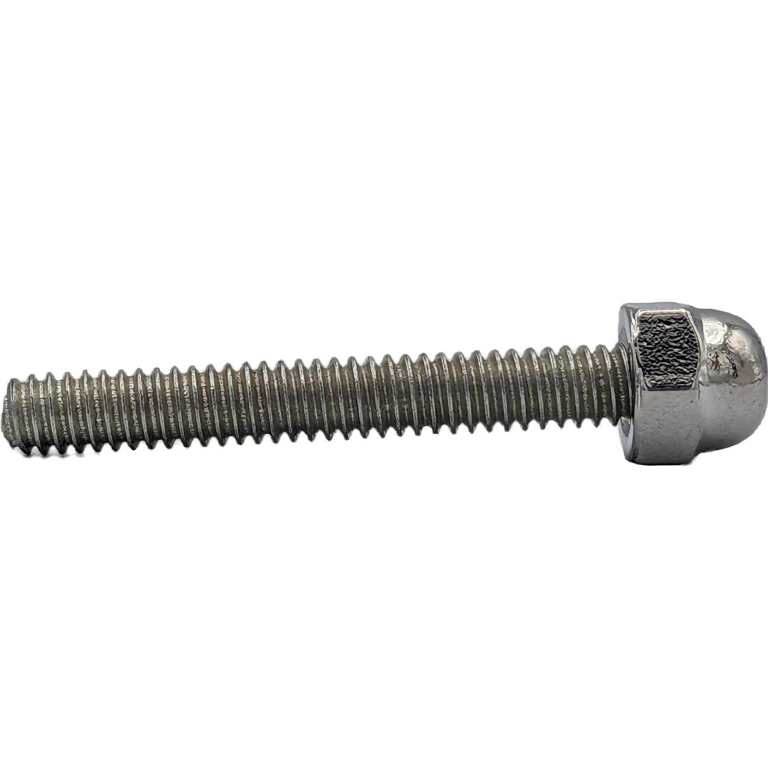 Our selection of 1/4"-20 Threaded Machine Screws come with a Acorn Nut that screws on. The length of the screw is approximately 2.15 inches. The width of the nut is approximately 0.5 inches. Finishes available for the Acorn Nut are Polished Chrome, Polished Brass, Antique Brass, and Black Bronze.