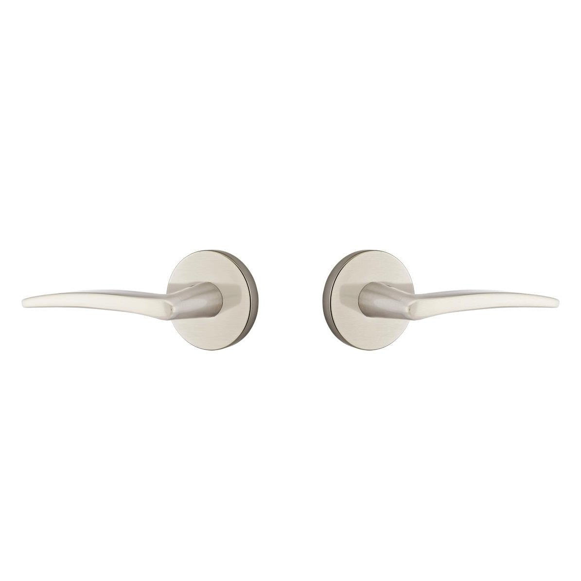 The Poseidon lever door knob shown here measures 5 inches in length by 2 1/2 inches wide with a 1 3/8 inch clearance. The disk rosette measures 2 1/2 inches overall. Includes the two levers and door rosettes. Functional sets also include the lever latch, face plate and strike plate. This set is made for modern doors and it fits any door thickness between 1 3/8 inch to 2 1/4 inches thick. Functional sets come with a 2 3/8 inch back set latch - and a 2 3/4 inch back set may be requested at no additional charge. This door lever set comes complete with mounting hardware. Handing is required for leversets. This particular product has a lead time of approximately 3 to 5 business days.
