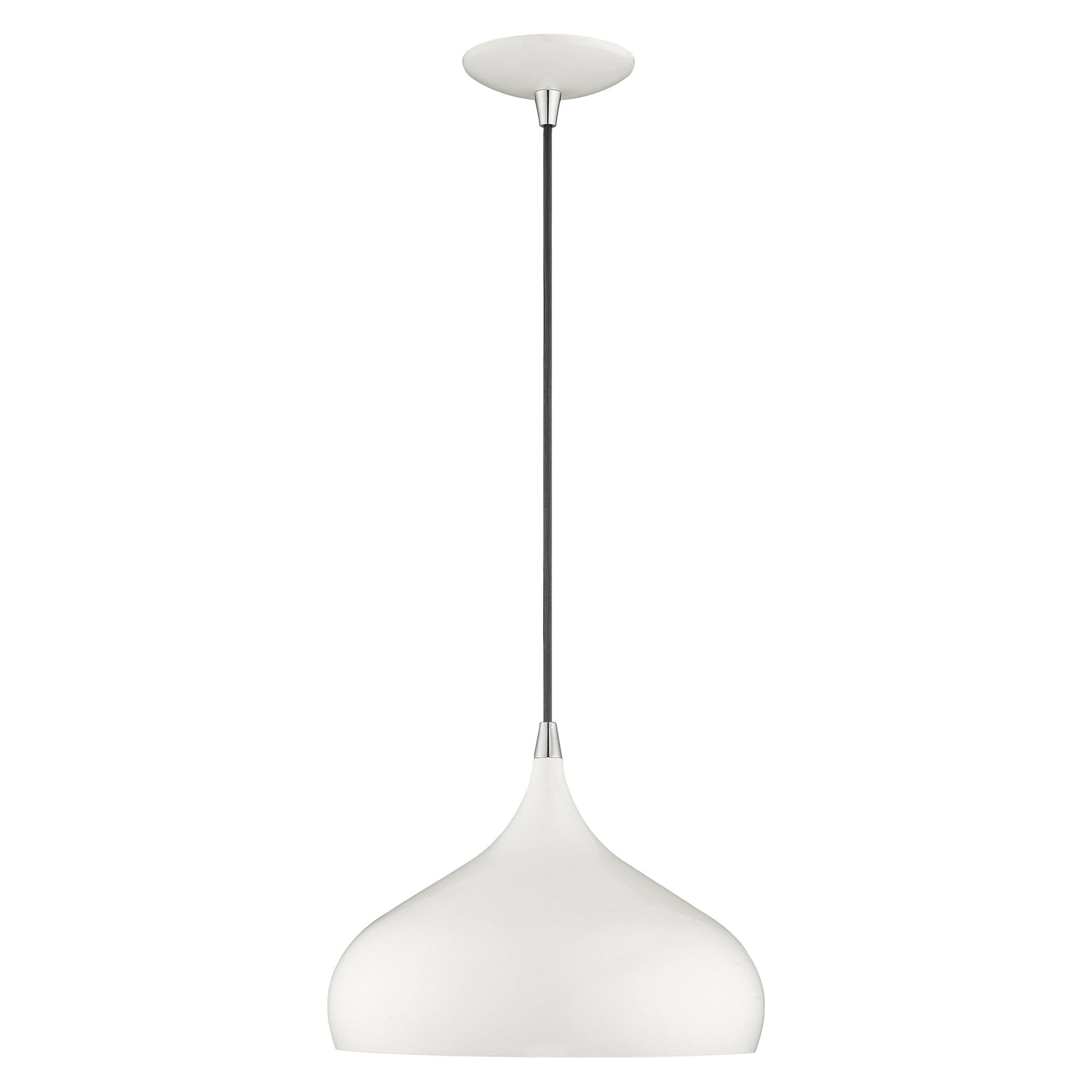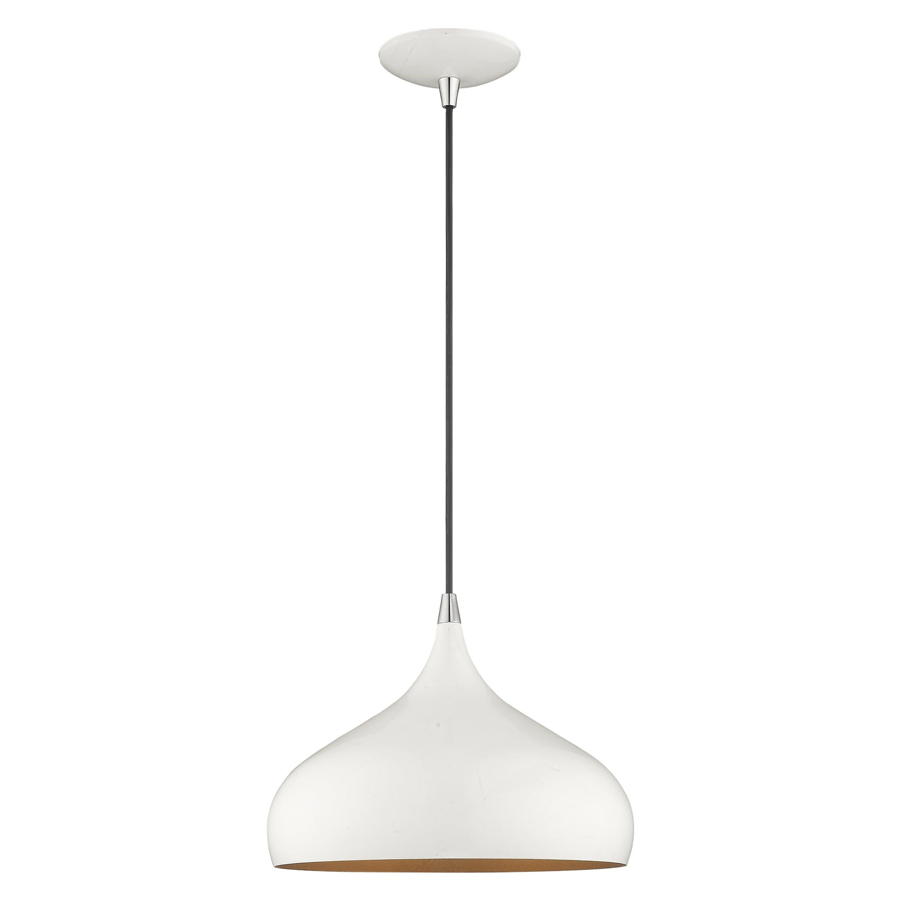 The 41172-69 Amador Pendant Light offers a modern and minimalistic appeal, featuring a chic shiny white metal shade with a striking gold finish on the inside. This adjustable fixture can be hung between 15 to 75 inches in height and has a diameter of 11.75 inches. Designed to accommodate one medium base bulb (not included) with a maximum wattage of 60W, it suits various settings and is suitable for damp locations. The pendant also showcases polished chrome accents, complementing its transitional style.