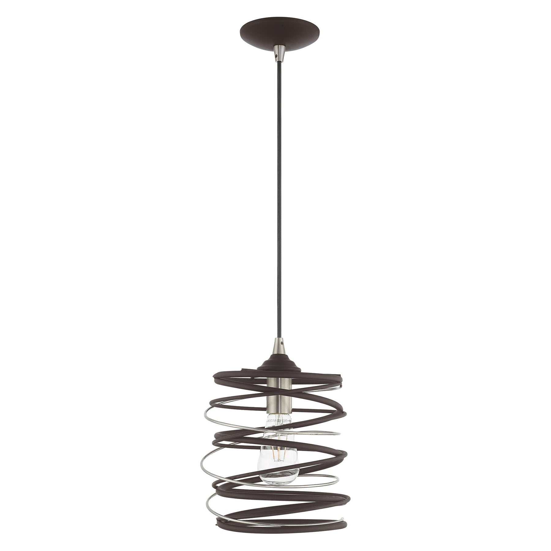The 41320-07 Mini Pendant offers a unique blend of contemporary design and practical functionality. This striking fixture features a bronze geometric metal shade and is designed to accommodate one medium base bulb with a maximum wattage of 60W (bulb not included). The height can be adjusted between 17 inches and 75 inches, while the 8.25-inch diameter shade adds a bold touch to any room. With a stylish bronze finish and brushed nickel accents, this pendant is also suitable for damp locations, making it a versatile choice for various spaces.