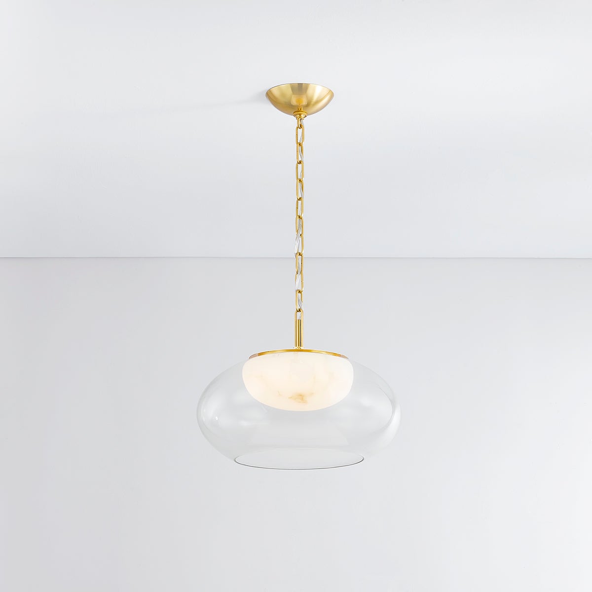 The Hudson Valley Lighting alabaster and glass pendant light combines elegance and functionality in a sophisticated design. Measuring 17.00 inches in width and 12.50 inches in height, it features a single integrated LED lamp with a wattage of 13.0 and an impressive CRI of 90, ensuring high-quality lighting. With a color temperature of 2700K and lumens output of 675, this fixture provides a warm and inviting ambiance. The aged brass finish option adds a touch of classic charm, while its field-serviceable feature allows for easy maintenance. Please note, this pendant is not rated for Title 24 compliance and does not require a plug-in installation.