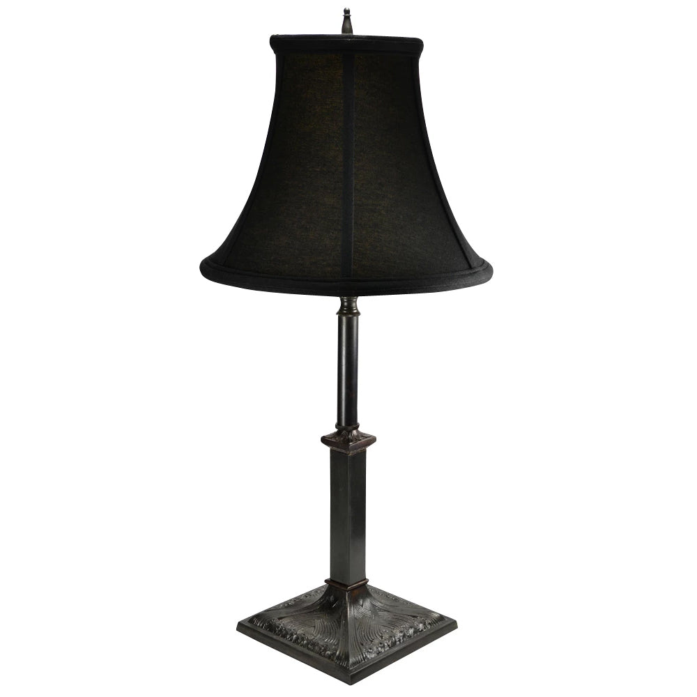 The base and finial are fashioned from solid brass, featuring thick-wall tubing with a rare and intricate square-to-round transition. Each lamp is individually crafted and assembled by skilled artisans, ensuring unparalleled quality and attention to detail. The lamp is operated by a convenient pole switch located at the bulb base, offering both functionality and aesthetic appeal.