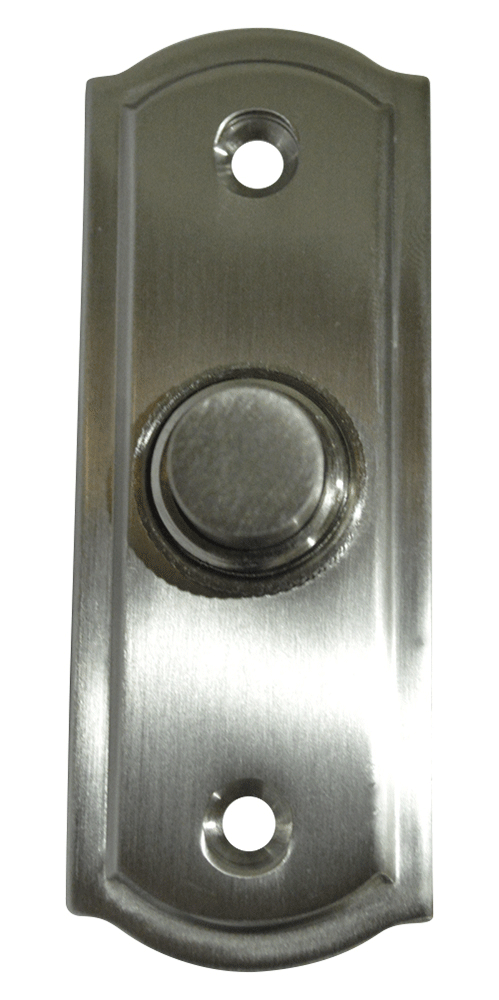 This door bell measures 3 inches by 1 1/8 inches and projects 7/8 inches. This classic door bell is easy installation, and is a quick and classic addition to your home. Available in Satin Nickel finishes. Comes complete with mounting hardware. The average lead time for this particular product is 2 to 3 Business Days.